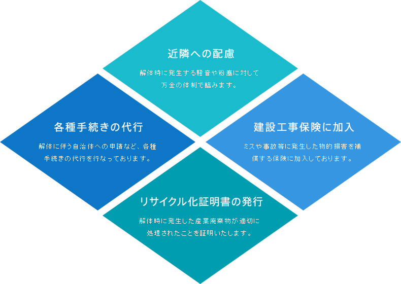 近隣の方々へご迷惑のかからないよう配慮を行ない、迅速に解体を完了させます。