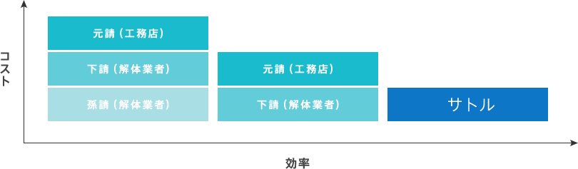 コスト削減ができるのはもちろんのこと、間に他業者を挟まずに直接解体業者とやりとりできるので要望を伝えやすく、また反映しやすい現場をつくり出すことでフローの効率化も図れます。